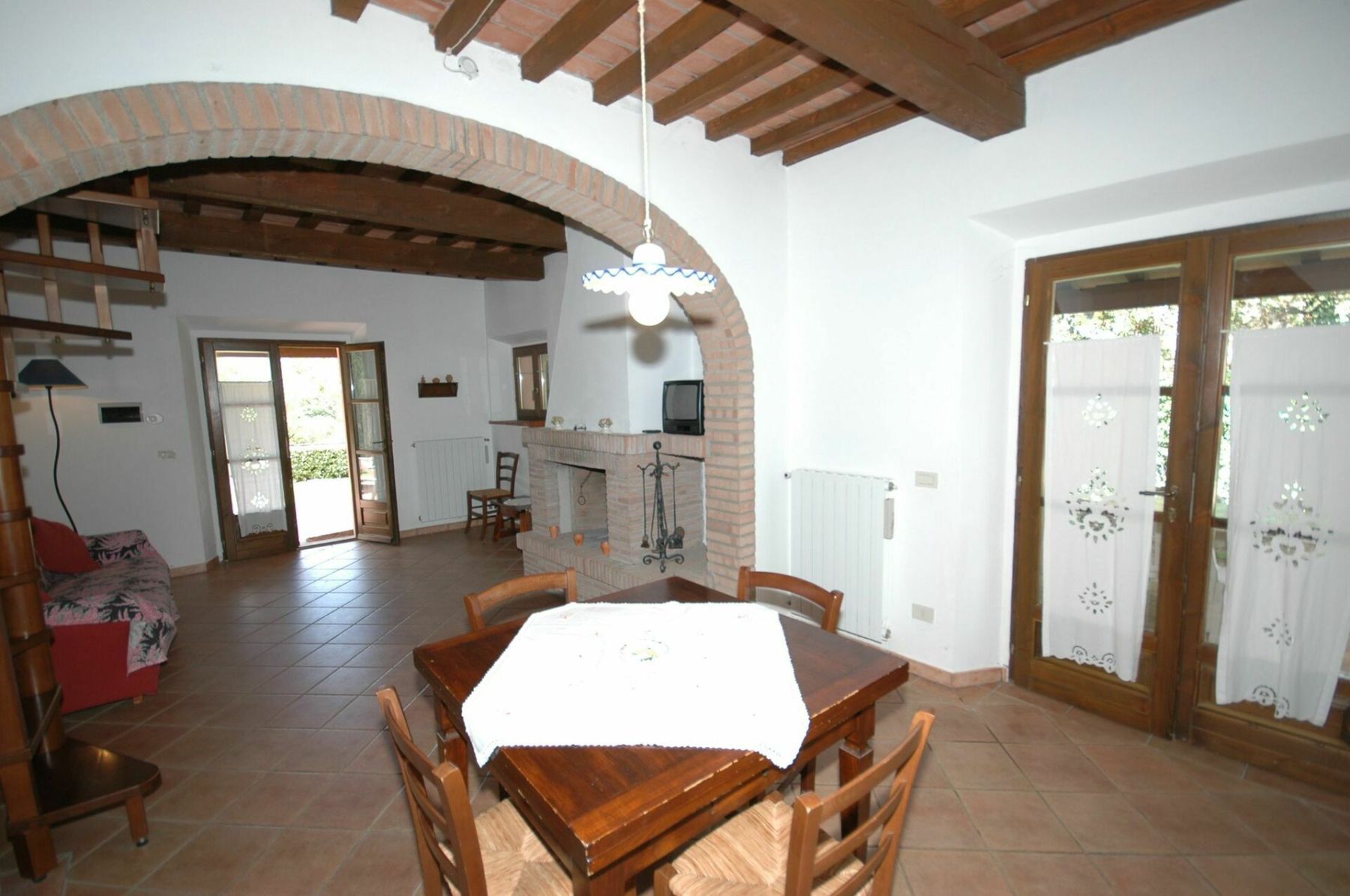 Spanning approximately 100 m² across two floors, the villa features exposed beams, terracotta floors, and high-quality rustic furnishings. On the ground floor, the living room includes a fireplace and a dining area, providing a cozy space for relaxation. Additionally, the fully equipped kitchen comes with an oven, fridge, and stovetop.