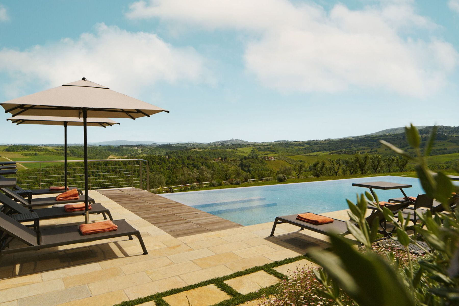 One of Villa Elmi’s most exclusive features is the private panoramic pool, 14 meters long and 5 meters wide, heated upon request to 28-30°C. The pool area is equipped with sun loungers, umbrellas, and an outdoor shower, offering breathtaking views of San Gimignano.