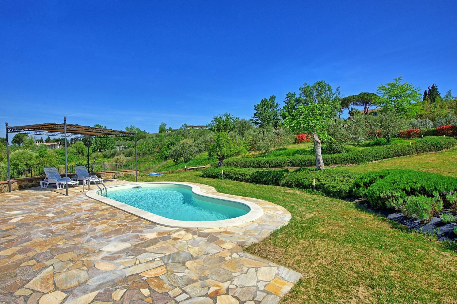 One of the highlights of Villa Roberto is undoubtedly its bean-shaped private pool (7 x 3 meters, depth 1.20 m), reserved exclusively for guests and open from April 1st to October 30th. The pool area is fully equipped with: