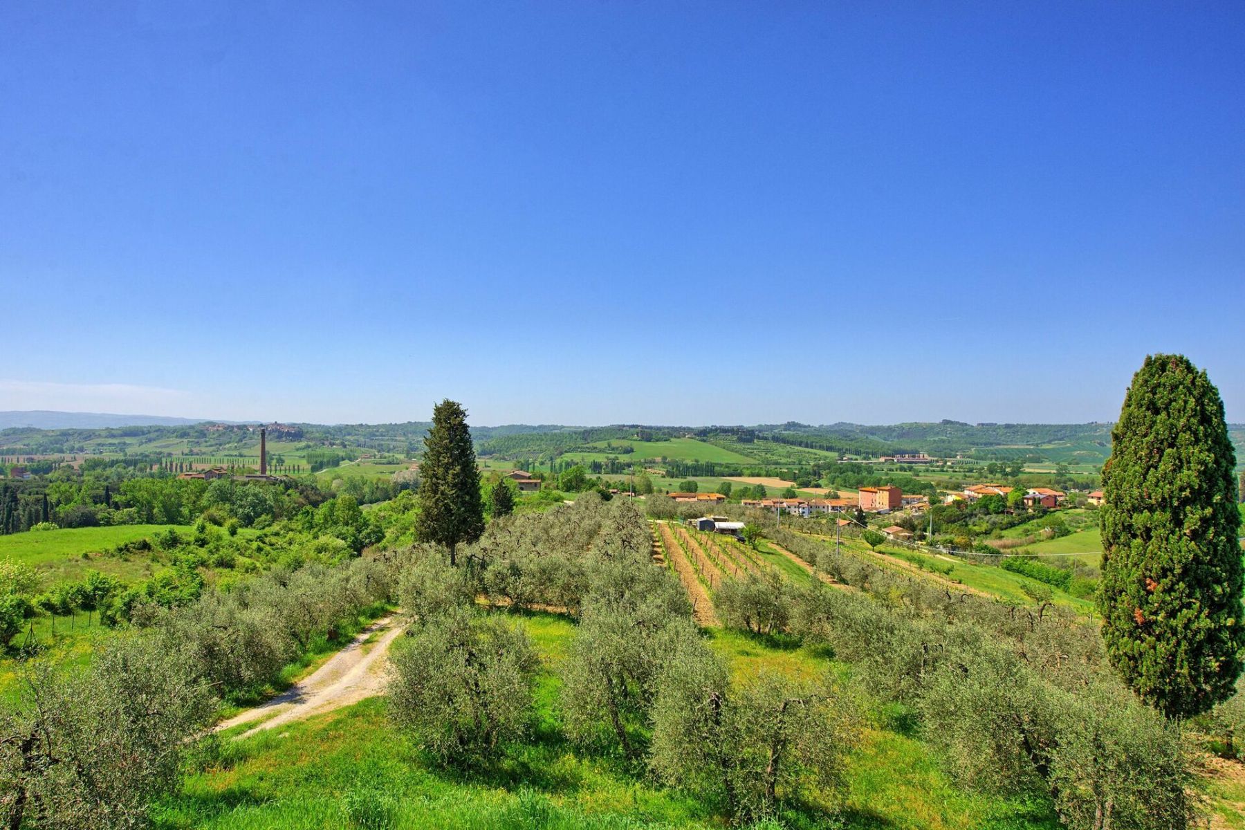 Il panorama circostante è semplicemente straordinario: da qui si possono ammirare le colline del Chianti e, nelle giornate più limpide, le torri di San Gimignano che svettano all’orizzonte.