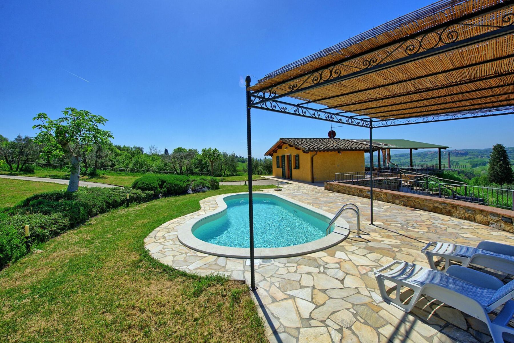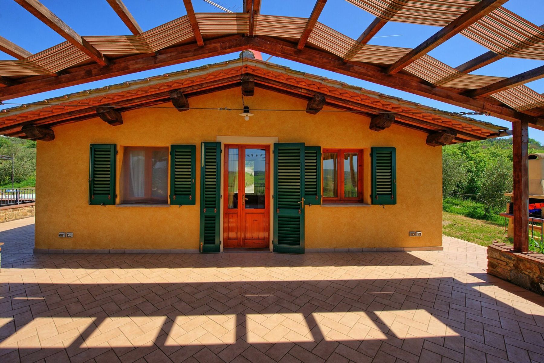 La casa è completamente indipendente e circondata da un giardino curato, perfetto per vivere momenti di pace e privacy assoluta. All’esterno, un’ampia terrazza panoramica con gazebo e tavolo da pranzo permette di godere di pranzi e cene all’aperto con una vista spettacolare sulla campagna toscana. Gli ospiti possono rilassarsi sui lettini prendisole, leggere un libro all’ombra o gustare un calice di vino locale mentre il tramonto colora le colline circostanti.