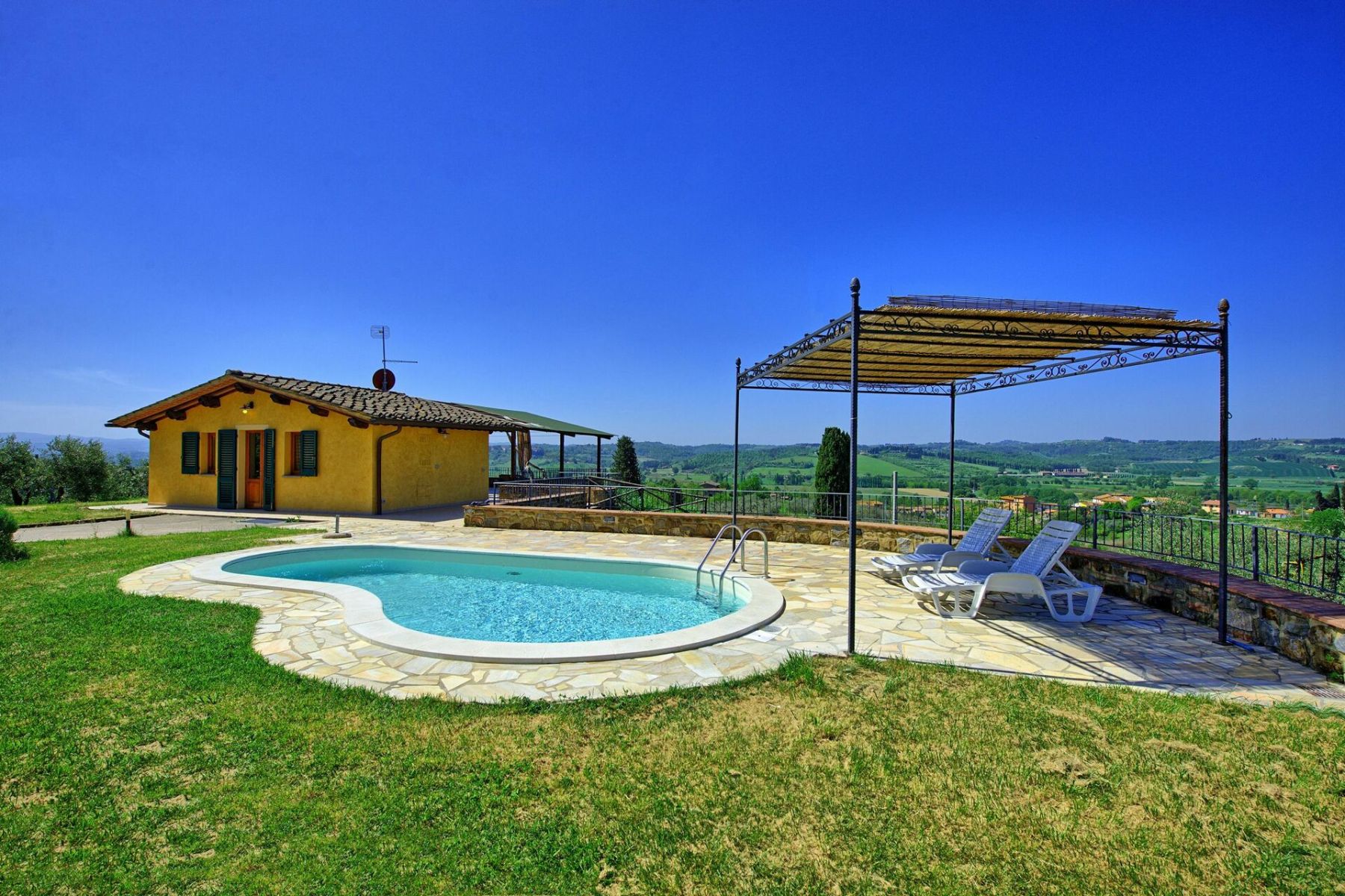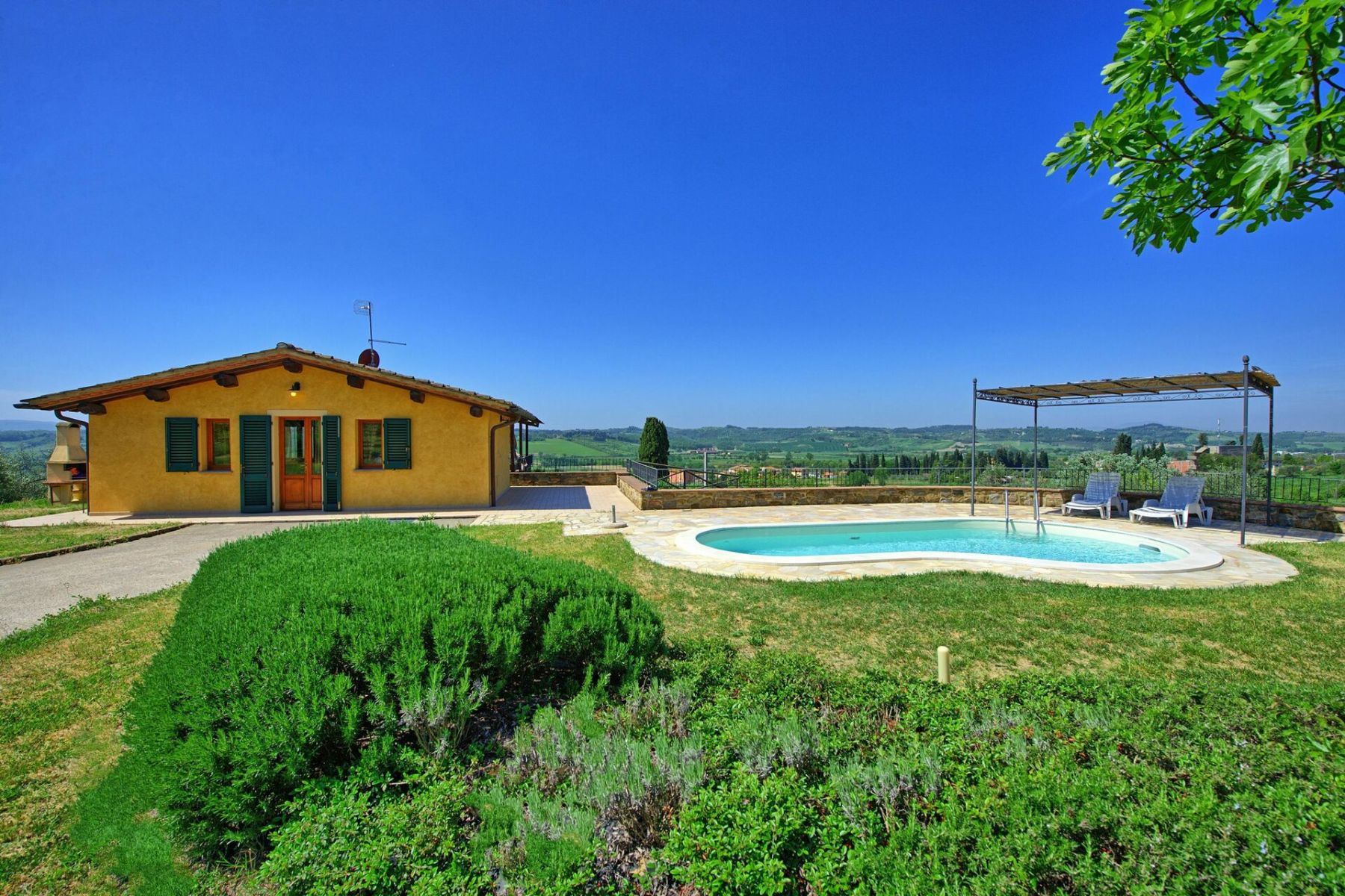 Con una superficie di 50 m² e un ampio giardino di 1000 m², Villa Roberto può ospitare fino a 4 persone in 2 camere da letto, ed è la scelta perfetta per chi desidera un rifugio tranquillo immerso nel verde, con una vista panoramica mozzafiato che spazia dal Monte Serra fino alle torri di San Gimignano.